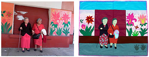 actuelles issues de la rue latino‐américaine (Santiago, Quito et Mexico) et les Arpilleras, ces broderies populaires qui, du temps de Pinochet, proposaient un autre récit du quotidien des Chiliens sous la dictature.