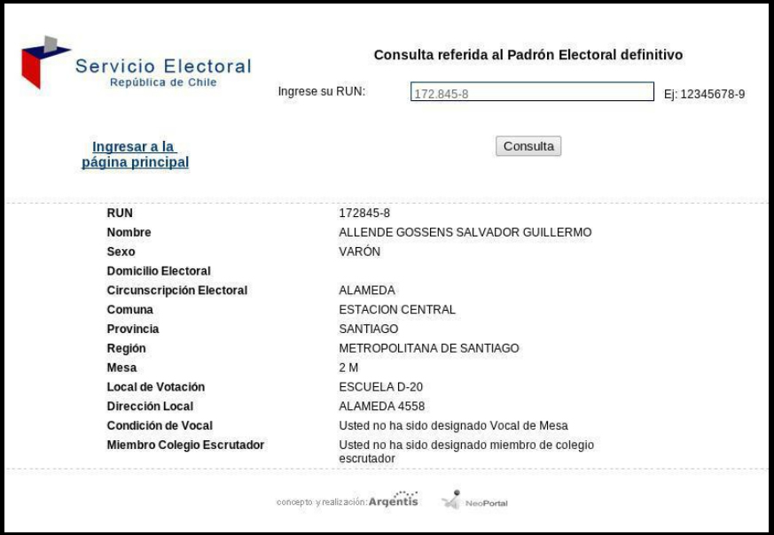 Sauf que, ce dimanche 28 octobre, jour d’élections municipales au Chili, les nouveaux registres électoraux [1] annonçaient, à la stupeur générale que le citoyen Salvador Guillermo Allende Gossens, Carte d’Identité N° 172845-8 était bel et bien vivant. Et tout à fait en mesure de voter dans une école du quartier ouest de Santiago. Encore heureux, sa fiche dans les registres électoraux (voir l’illustration) précisait qu’il "n’a pas été nommé assesseur de son bureau de vote".