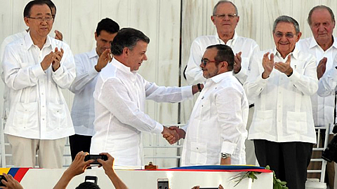 C’est en présence du secrétaire général des Nations Unies, Ban Ki-Moon, de nombreux chefs d’état d’Amérique Latine ainsi que du secrétaire d’État US John Kerry, du roi Juan Carlos et de plus de 2500 invités spéciaux, que Juan Manuel Santos et Rodrigo Londoño ont signé l’accord qui met fin à 52 ans de conflit.